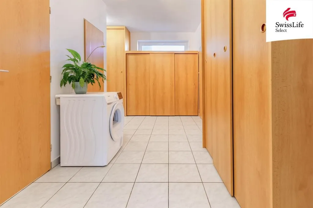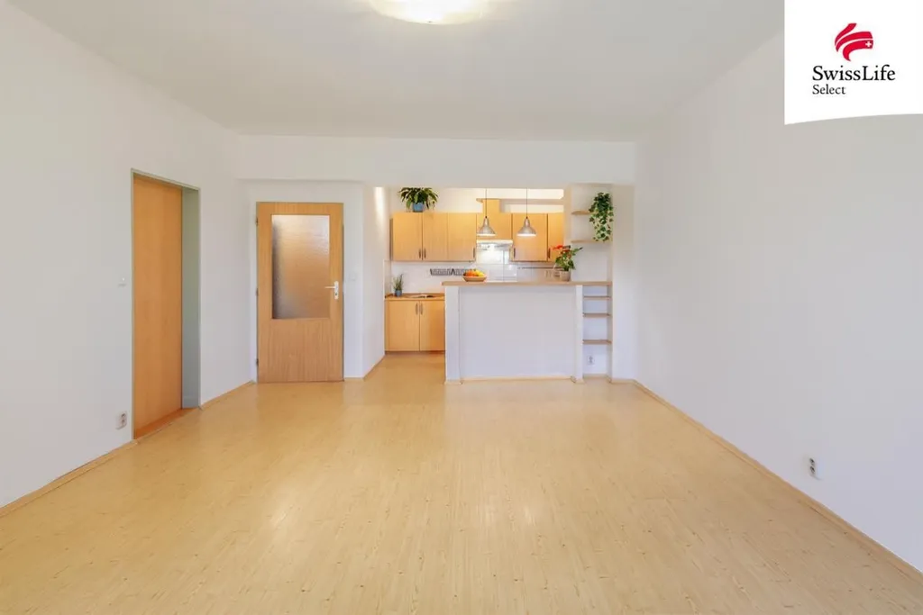 Obývací pokoj spojený s kuchyňským koutem je dostatečně velký, aby se sem vešla sedací souprava i jídelní stůl pro rodinu. Ložnice z něj přístupná je vybavená úložným prostorem a i z ní je vstup na lodžii. Nadstandardní množství úložných prostor je ve velké předsíni. Z ní jsou přístupné jak další pokoj, tak koupelna, samostatná toaleta i komora. Byt je kromě kuchyňské linky vybaven také lednicí, pračkou a sušičkou. Vytápění bytu i ohřev vody je centrální dálkový.