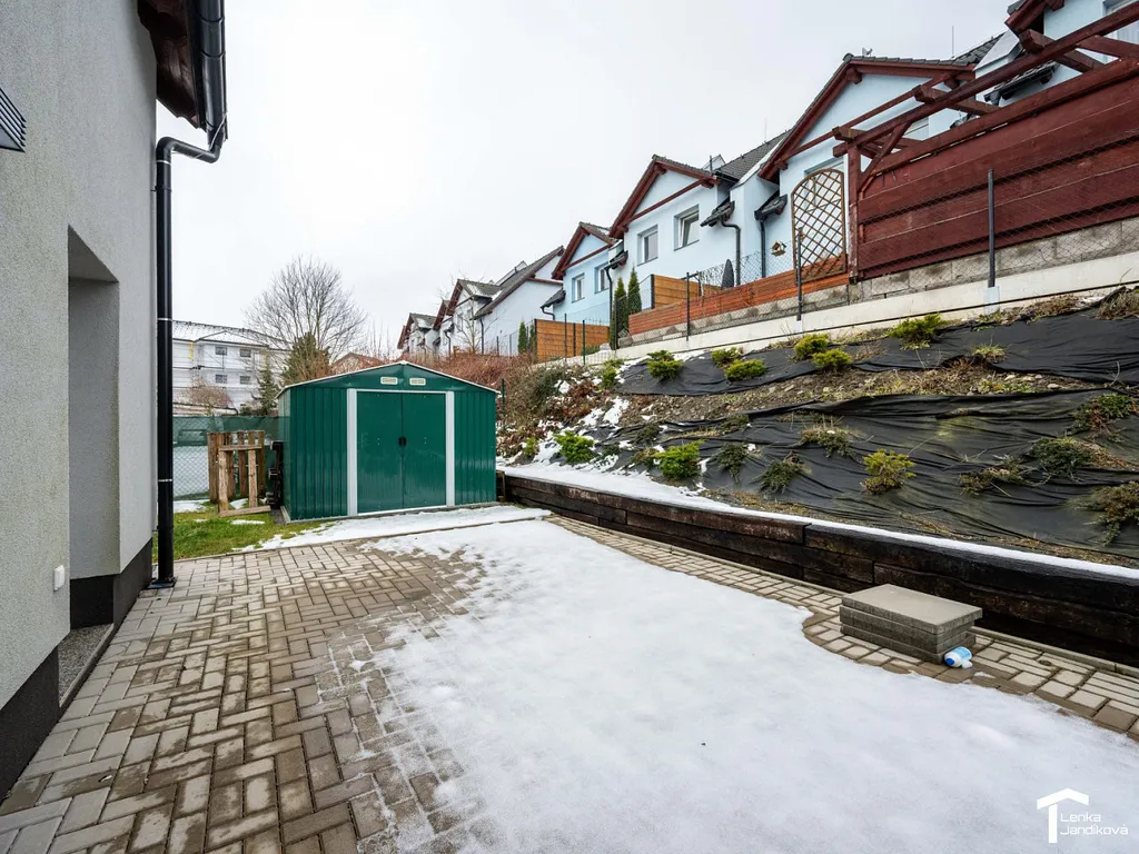Patrový dům je dispozičně řešený jako 4+kk o celkové výměře 120m². Po vstupu do domu se v přízemí nachází prostorný obývací pokoj, který je spojený s kuchyňským koutem. Kuchyňská linka má vestavěnou myčku, elektrickou troubu, indukční desku a digestoř. Dále je zde prostor pro umístění volně stojící lednice s mrazákem. Z obývacího pokoje je vstup na terasu. V přízemí je dále koupelna, která je osazena sprchovým koutem a je společná s WC. V patře se nachází tři samostatné pokoje a dále WC, kde je umístěný plynový kotel a přípojka na pračku.