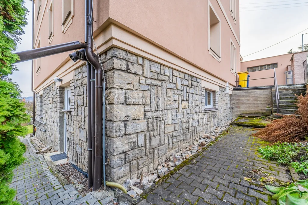 Přestože jde o suterénní podlaží, byt je světlý díky velkým oknům a orientaci. V bytě je zajištěno komfortní podlahové vytápění (napojené na plynový kotel). Podlahy jsou jednotně řešeny plovoucí krytinou v dekoru dřeva. Obývací pokoj s kuchyňským koutem je hlavním společenským prostorem. Odtud je přímý přístup prosklenými dveřmi na terasu a společnou zahradu. Kuchyňská linka je kompletně vybavená vestavěnými spotřebiči, které zahrnují varnou desku, troubu, digestoř, mikrovlnnou troubu a myčku nádobí. Dispozici doplňuje samostatná ložnice. Koupelna je zařízena ve světlých tónech a obsahuje sprchový kout, umyvadlo se skříňkou, WC a otopný žebřík. Byt je nabízen jako nezařízený, přesně tak, jak jej vidíte na fotografiích (vybavení tvoří pouze kuchyňská linka a pevné prvky v koupelně).