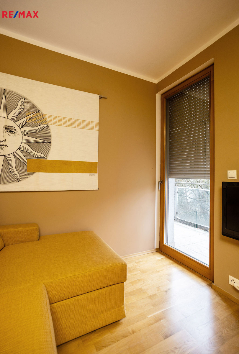 Byt s podlahovou plochou 51,2 m² je situován v 1. nadzemním podlaží osmipodlažního domu z roku 2010, postaveného ve vysokém standardu. Interiér bytu zdobí velká francouzská okna, která poskytují krásný výhled do zahrady domu a zároveň prostor zaplavují denním světlem. Dům je umístěn ve svahu.