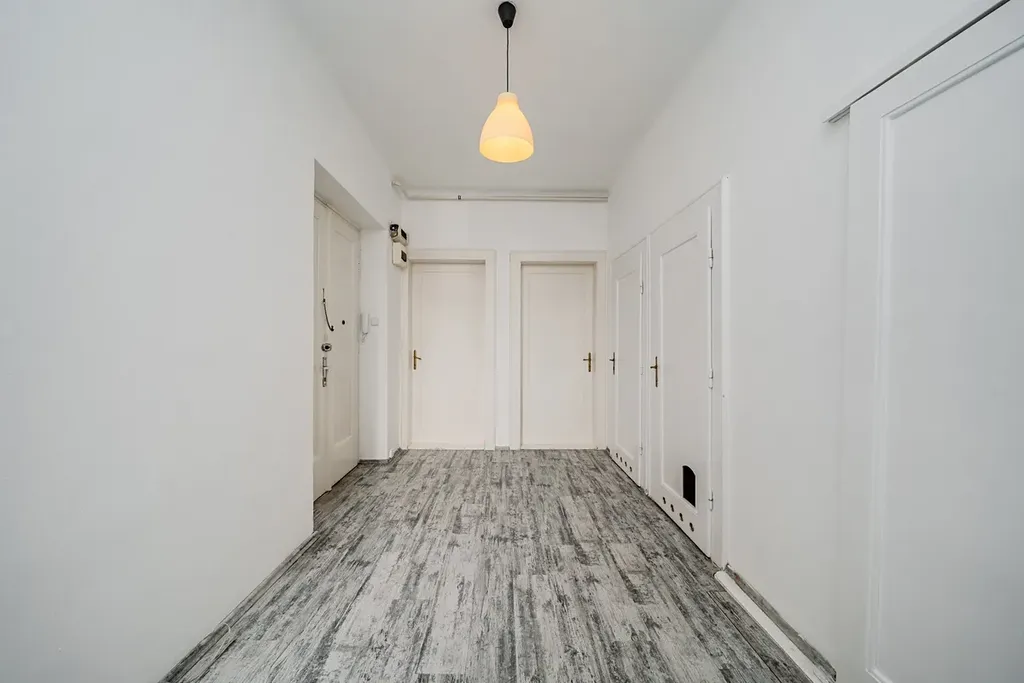 Byt se nachází v domě z období první republiky, typickém pro kvalitní městskou výstavbu 30. let 20. století. Společné prostory domu zaujmou zachovanými původními prvky – litým terrazzo povrchem schodů, tmavými keramickými sokly a elegantním kovovým zábradlím s dřevěným madlem, odpovídajícím funkcionalistickému stylu této doby.