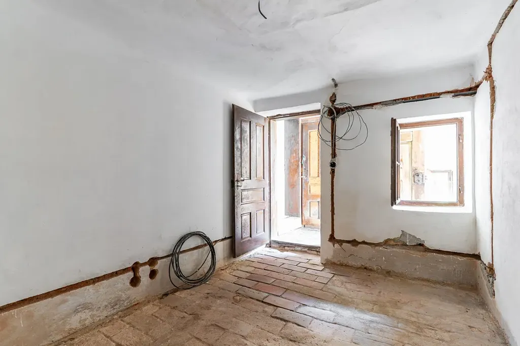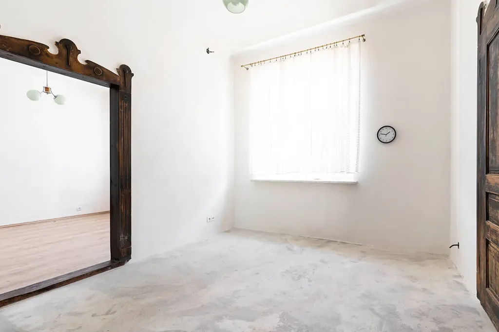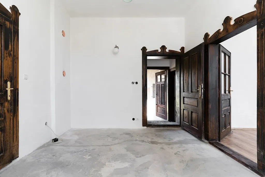 Historické prvky: Zachovány zdobené portály dveří a původní dlažba, které čekají na zakomponování do Vašeho nového interiéru.
