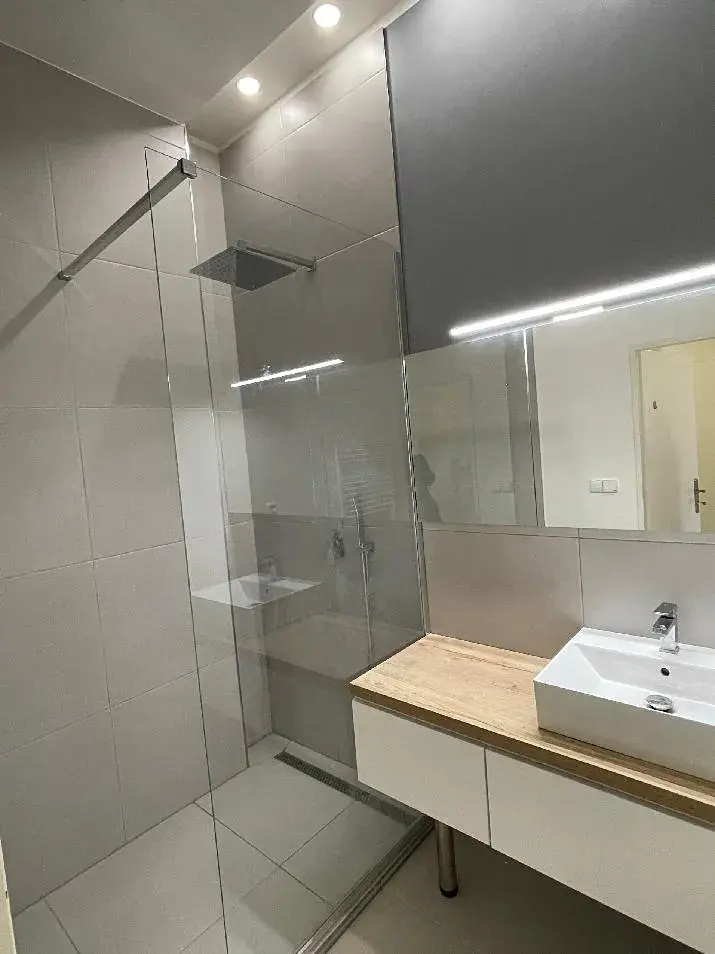Byt je vybaven moderní kuchyňskou linkou s vestavěnými spotřebiči, jídelním stolem, nadčasovým moderním osvětlením. V koupelně je umístěn sprchový kout nadstandartní velikosti, umyvadlo, zrcadlo. WC je samostatné s umývátkem.