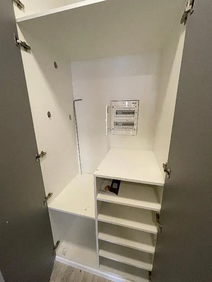 V prostoru chodby jsou vestavěné skříně, prostor a připojení pro pračku i sušičku. Je zde umístěn rovněž elektrokotel, který zajišťuje topení a ohřev vody.