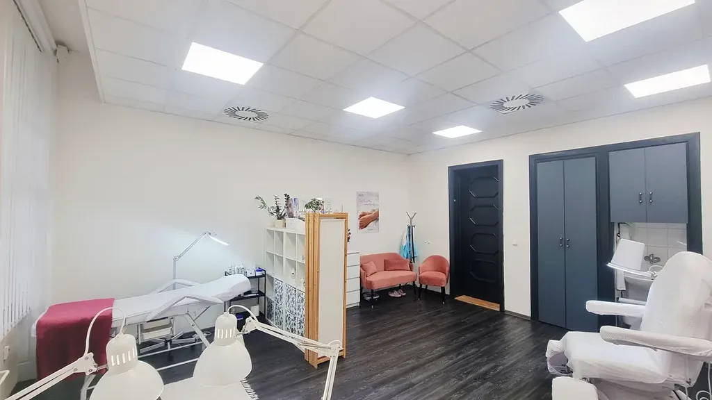 Kosmetický salón (30 m²) se nacházejí v 1. patře kompletně zrenovované budovy se dvěma výtahy a denní recepcí.