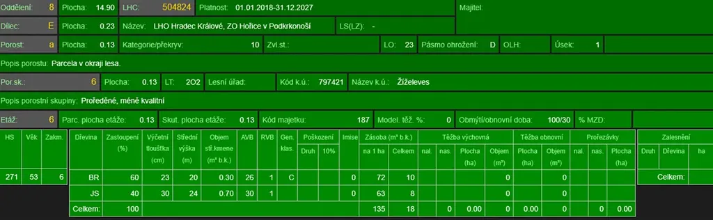 - p.č. 781 vedená jako lesní pozemek o celkové výměře 1 080 m2 (stáří lesa 60 let - zastoupení dřevin bříza, jasan)