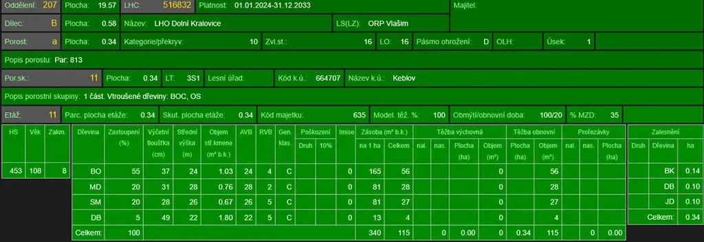 - p.č. 813 vedená jako lesní pozemek o celkové výměře 3 400 m2 (stáří lesa 109 let - zastoupení dřevin borovice, modřín, smrk, dub)