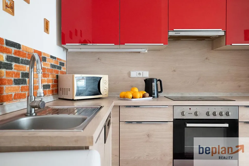 Kuchyňská linka v kombinaci přírodního dřevodekoru a výrazného červeného lesklého povrchu přináší do prostoru nádech modernosti a osobitosti. Je to ta nenucená kombinace funkcionality a stylu, která umožňuje budoucím majitelům připravovat ranní kávu nebo večeři po dni stráveném v lázních s pocitem, že stojí na místě, které má duši. Plastová okna zajišťují příjemnou tepelnou izolaci a tiché prostředí, a dálkové vytápění dodává komfort a bezstarostnost, které se od kvalitního bydlení na této úrovni očekávají.