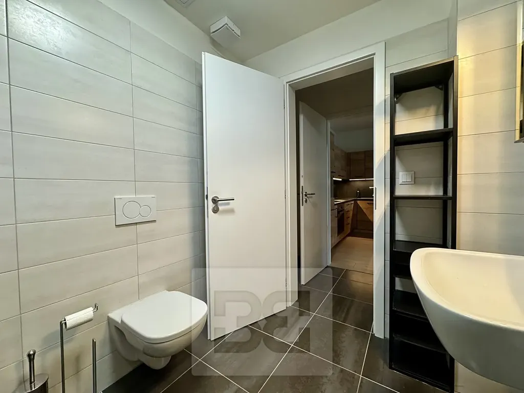 Koupelna je přístupná přes malou chodbu, kde je vyvedena přípojka na pračku. V koupelně se nachází sprchový kout, WC a umyvadlo.