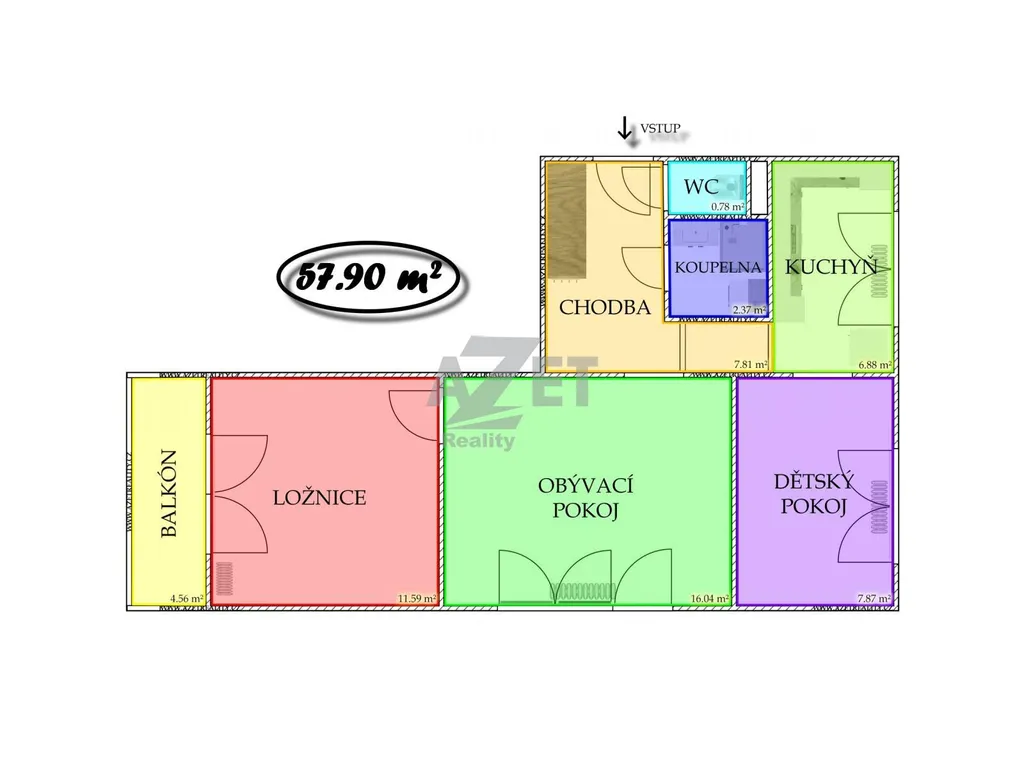 - WC - 0,78 m2 o rozměrech 0,84 x 0,92 m