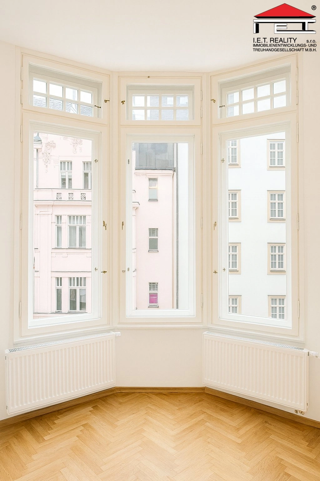 Pokoj je světlý, má parketové podlahy a okna orientovaná přímo do historického centra města.