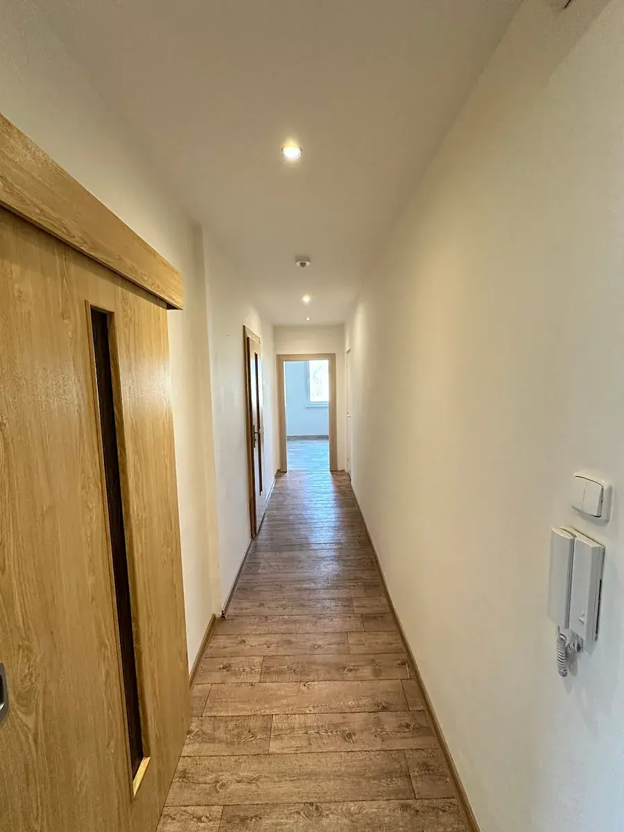 Dispozice: prostorná dlouhá vstupní chodba, koupelna s vanou, umyvadlem a WC, komora, ložnice, obývací pokoj, kuchyně s lodžií, pokoj.