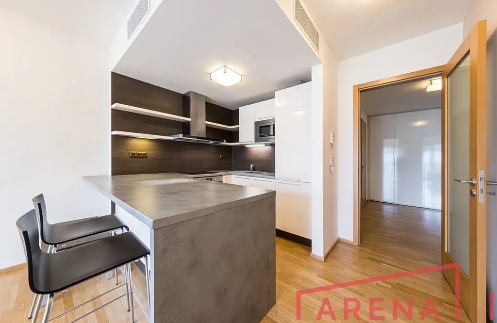 Hlavní prostor bytu tvoří obývací pokoj s plně vybaveným kuchyňským koutem a barový pult s posezením, ložnice je vybavená vestavěnou skříní a postelí zn. Saffron, velkorysé úložné prostory jsou ve vstupní hale.