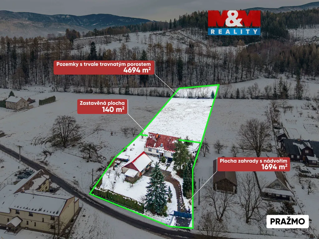 Nabízíme k prodeji výjimečný rodinný dům v malebné obci Pražmo, se zastavěnou plochou 140 m2 a užitnou plochou více než 180 m². K domu náleží rozlehlý pozemek o výměře 6.250 m². Perfektní místo pro rodinné bydlení či rekreační využití. Dispozice - v přízemí 4+1 a v 1. NP 2+1 prostorných místností. V každém patře se nachází koupelna i toaleta. Tento samostatně stojící zděný dům je po rozsáhlé rekonstrukci a ve velmi dobrém stavu: zateplení, dřevěná euro okna, rozvody elektřiny a vody apod. Dům je celý podsklepený, s kotelnou a garáží. K domu dále náleží dvě samostatné garáže a okrasná oplocená zahrada s nádvořím o ploše 1.694 m2. Nechybí zastřešená terasa, balkon, studna, skleník, el. brána a dostatek parkování. K nemovitosti náleží i pozemek s trvalým travnatým porostem a potokem s plochou 4.694 m2, ideální jako pastvina. Skvělá celoroční dostupnost. V obci veškerá občanská vybavenost (škola, školka, obchody, pošta, zastávka autobusu 750 m). Nechejte se okouzlit touto příležitostí.