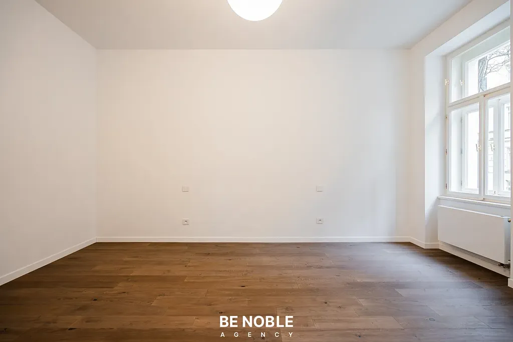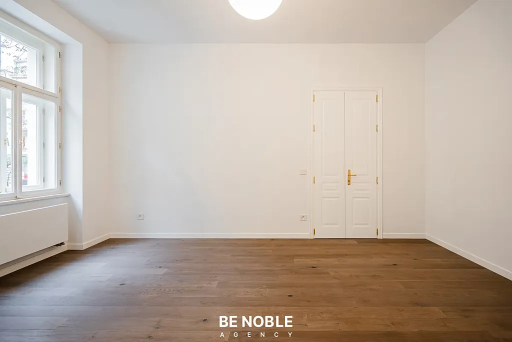 Rádi bychom Vám nabídli k pronájmu částečně zařízený luxusní byt 3+kk o celkové ploše 95,7 m², který se nachází ve zvýšeném přízemí (fakticky téměř v úrovni 2. nadzemního podlaží, vnější parapet oken je ve výšce 220 cm) prestižního projektu Royal Palace v jedné z nejžádanějších lokalit Prahy – na Vinohradech, pouhé 3 minuty chůze od náměstí Jiřího z Poděbrad a 1 minutu od parku Riegrovy sady.