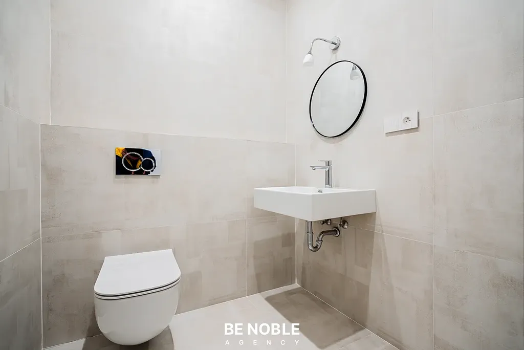 Součástí bytu je dále prostorná a působivá předsíň o velikosti 13,9 m², velká koupelna s walk-in sprchovým koutem, WC, umyvadlem a bidetem (5,4 m²), samostatná toaleta s WC a umyvadlem (3 m²), prádelna s přípravou pro instalaci pračky a sušičky (2,4 m²) a také praktická komora (2,4 m²). K bytu náleží také sklepní kóje o velikosti 2 m².