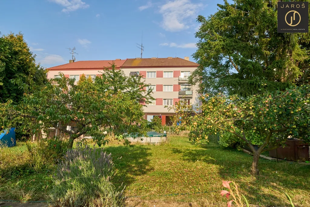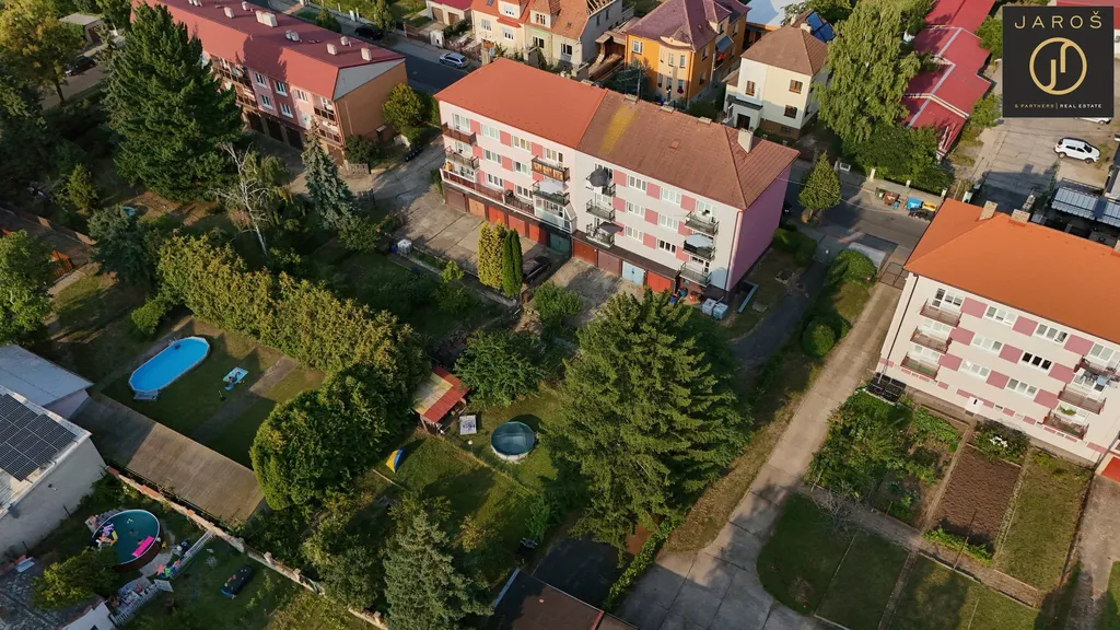 na úrovni 1. patra. Komfortnost bytu umocňuje nově vymalovaný zděný sklep a vyštukovaná garáž 14m2 s novými elektrickými rozvody vč. nového osvětlení, umístěná ze zadní strany domu. Ke každému bytu v domě náleží malý kousek vlastní zahrádky, což je jen dalším bonusem. Dům je napojený na městské vytápění a je zateplen.