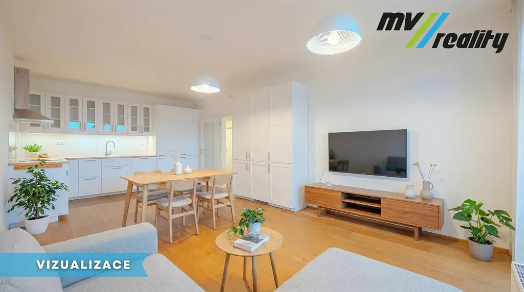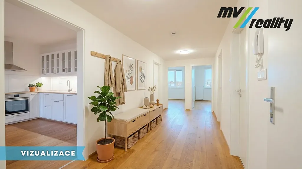 Dominantou bytu je prostorný obývací pokoj s kuchyňským koutem, který tvoří srdce celého domova. Dispozice dále nabízí ložnici, dětský pokoj, pracovnu, koupelnu s WC, samostatné WC a vstupní chodbu.