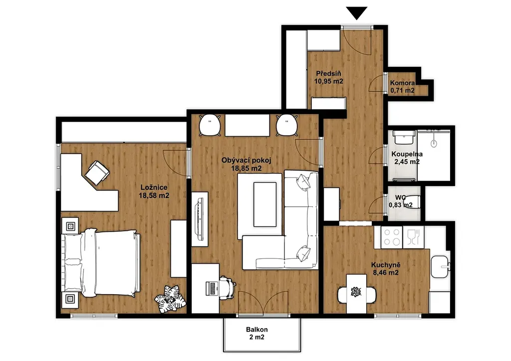 Obývací pokoj (18,85 m²) se vstupem na balkon, ložnice (18,58 m²), kuchyň (8,46 m²), koupelna, samostatné WC, komora a prostorná chodba.