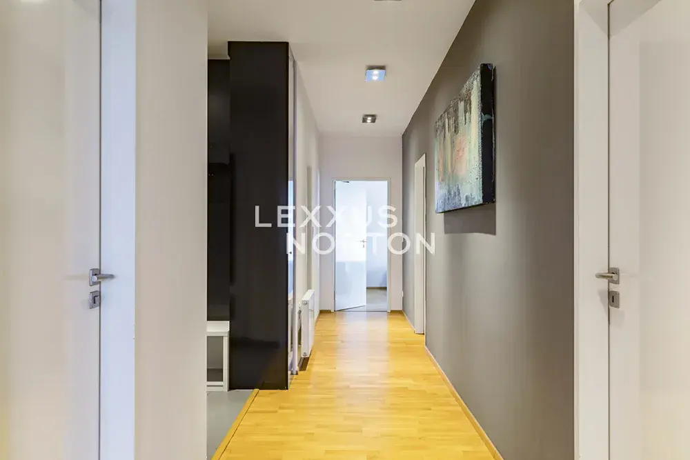Součástí vybavení nemovitosti je moderní kuchyňská linka se spotřebiči - sklokeramickou deskou, troubou, lednicí, mrazákem, myčkou nádobí, mikrovlnnou troubou a vinotékou. K dispozici je koupelna se sprchovým koutem druhá koupelna je vybavena vanou. V bytě se dále nacházejí vestavěné skříně, pračka, příprava pro sušičku a je zajištěn vysokorychlostní internet.