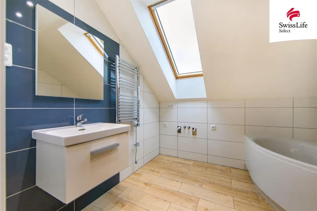 Ve spodní části domu najdete rozlehlý obývací pokoj s kuchyňským koutem ve tvaru U, součástí je varná deska a trouba (nejsou ještě zabudované), dále dvě prostorné ložnice a moderní koupelnu s vanou, ze které je vstup na WC.