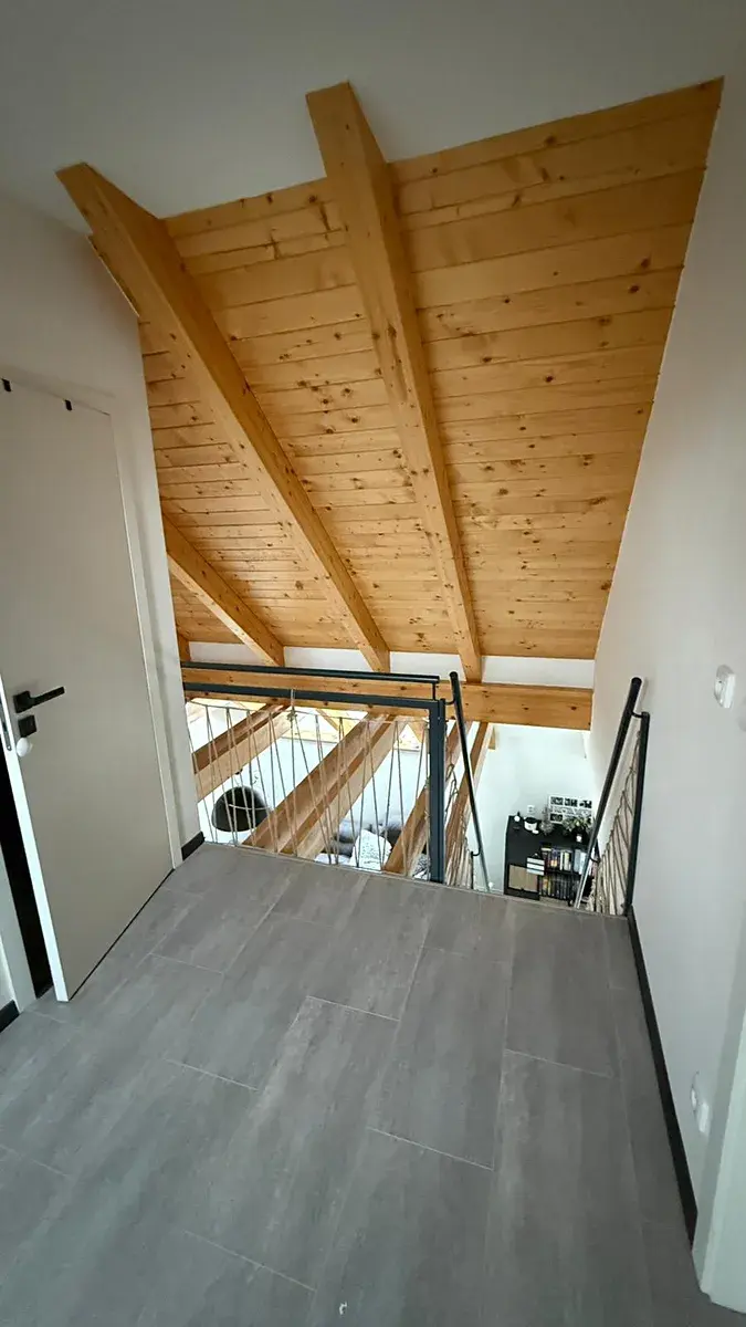V patře bytu je pokoj, koupelna se sprchovým koutem a WC a úložný prostor. Topení ve spodním patře je podlahové, v horním radiátory.