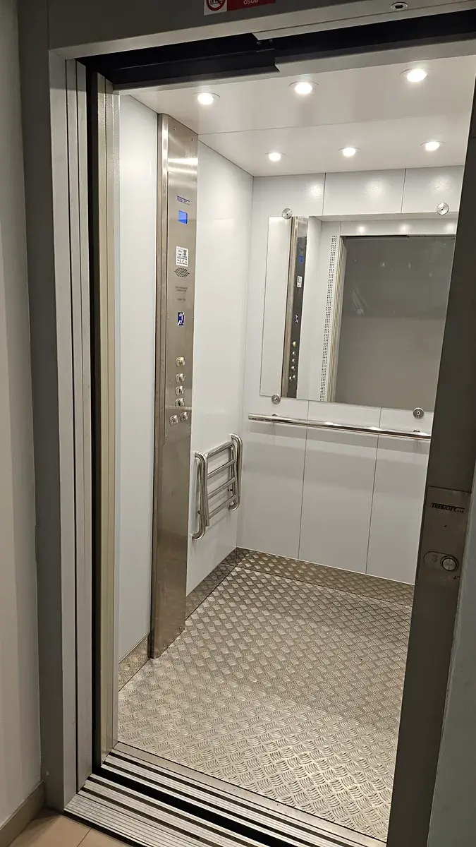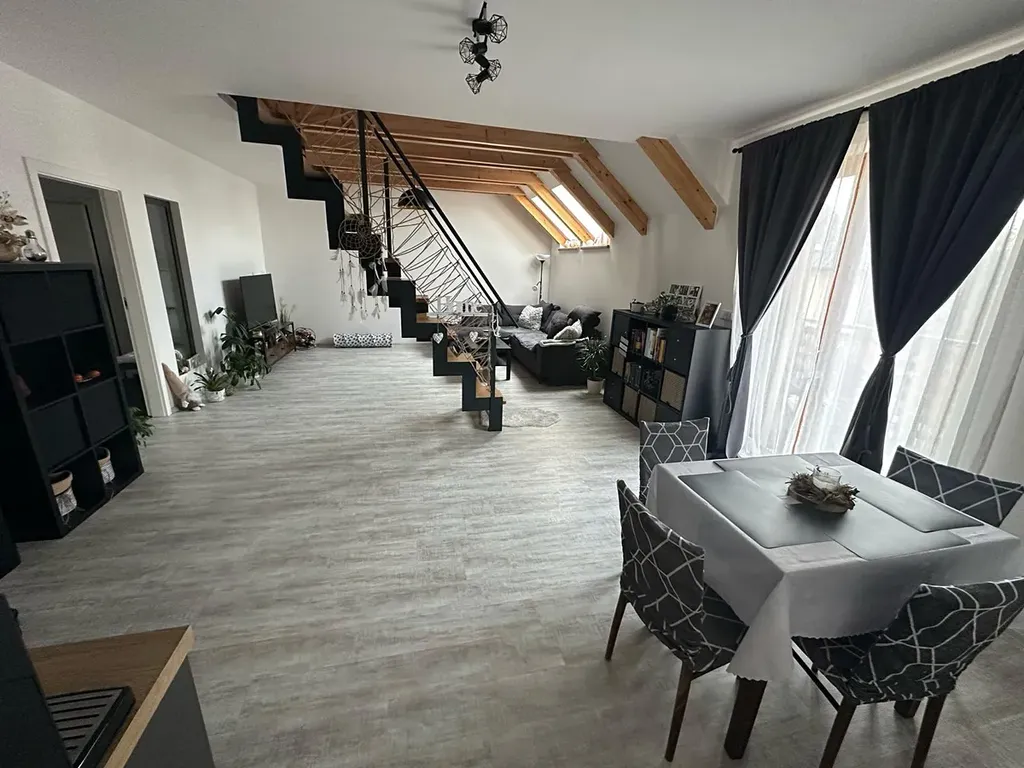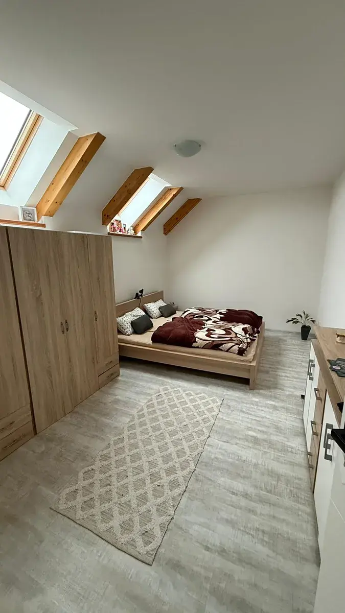 Byt je částečně vybavený a nachází ve 3. a 4. NP novostavby zděného domu s výtahem, dispozičně řešen jako 3+kk. Ve spodním patře bytu se nachází vstupní chodba , koupelna s vanou a WC, ložnice a prostorný obývací pokoj se vstupem na lodžii (8,7 m2) a schody do horního patra. V obývacím prostoru je na míru vyrobená, kompletně vybavená kuchyňská linka.
