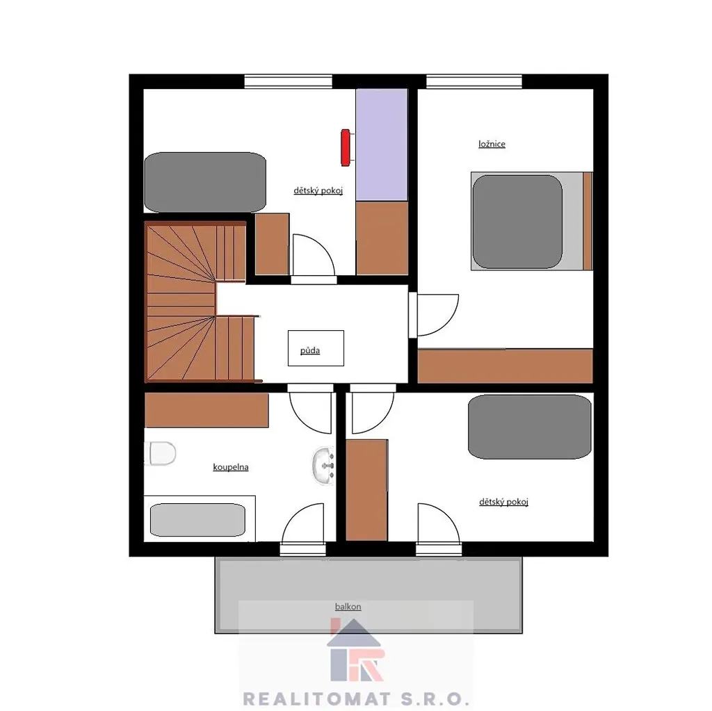 2. nadzemní podlaží: Tři prostorné pokoje a koupelna s WC. Z koupelny a jednoho z pokojů je přístup na balkon. Koupelna je vybavena přípojkou na pračku a technickým zázemím pro vytápění domu a ohřev vody (elektrokotel a elektrický bojler).