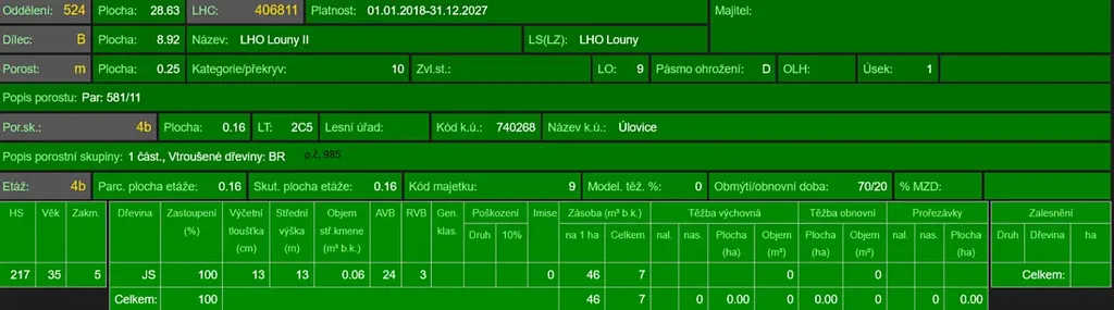 - p.č. 985 vedená jako lesní pozemek o celkové výměře 2 571 m2 (stáří lesa 42 let - zastoupení dřevin jasan, stáří lesa 38 let - zastoupení dřevin borovice)