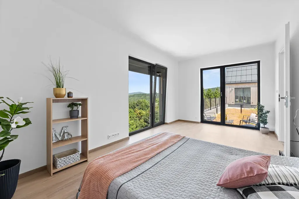 Nabízíme k prodeji exkluzivní dřevostavbu postavenou na střeše bytového domu - kompromis mezi bytem a domem s bezkonkurenčními výhledy. Jedná se o dispozici 3+kk a celkové výměře 89,1 m² dle NOZ (čistá užitná plocha 85,9 m²) a je orientován na všechny světové strany. K domu náleží dvě terasy, předzahrádka a samozřejmě sklepní kóje přímo na patře o velikosti 2,8 m². Cena zahrnuje i parkovací stání – vše je uvedeno včetně DPH.