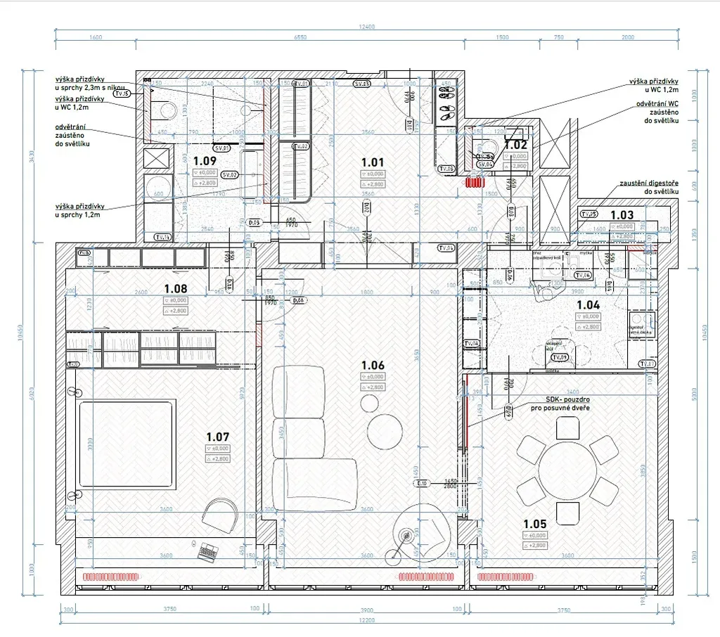 Z prostorné vstupní haly jsou samostatné vstupy do všech obytných i technických částí bytu. Originální truhlářské prvky, kuchyňská linka, vestavěné skříně od výrobce CZ Interiér.