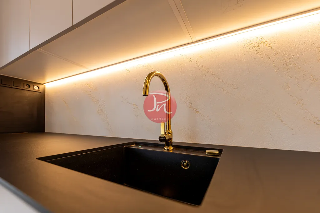Byt se vyznačuje moderním designem a vysokou kvalitou použitých materiálů, které splňují nároky i těch nejnáročnějších klientů. Interiér je promyšleně rozvržen tak, aby poskytoval maximální komfort a zároveň důvody k relaxaci. Prostorný obývací pokoj s velkými okny nabízí nádherný výhled na městskou panorama a přirozené osvětlení, které vytváří příjemnou atmosféru po celý den.