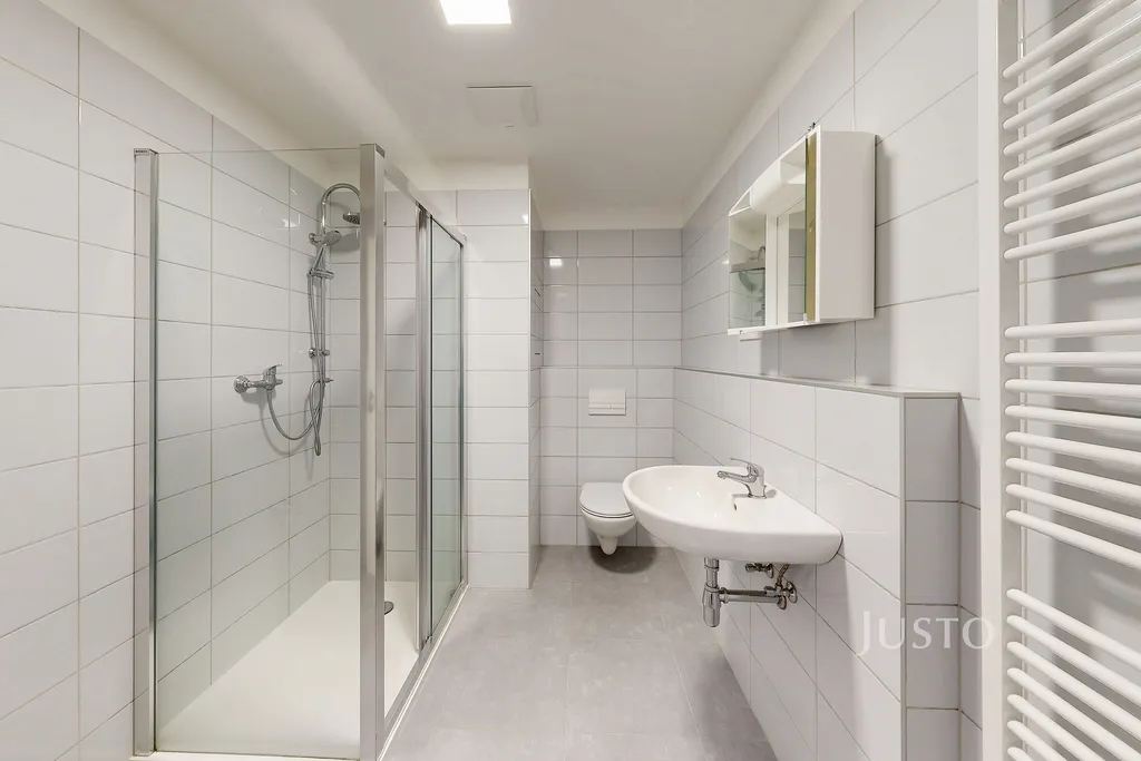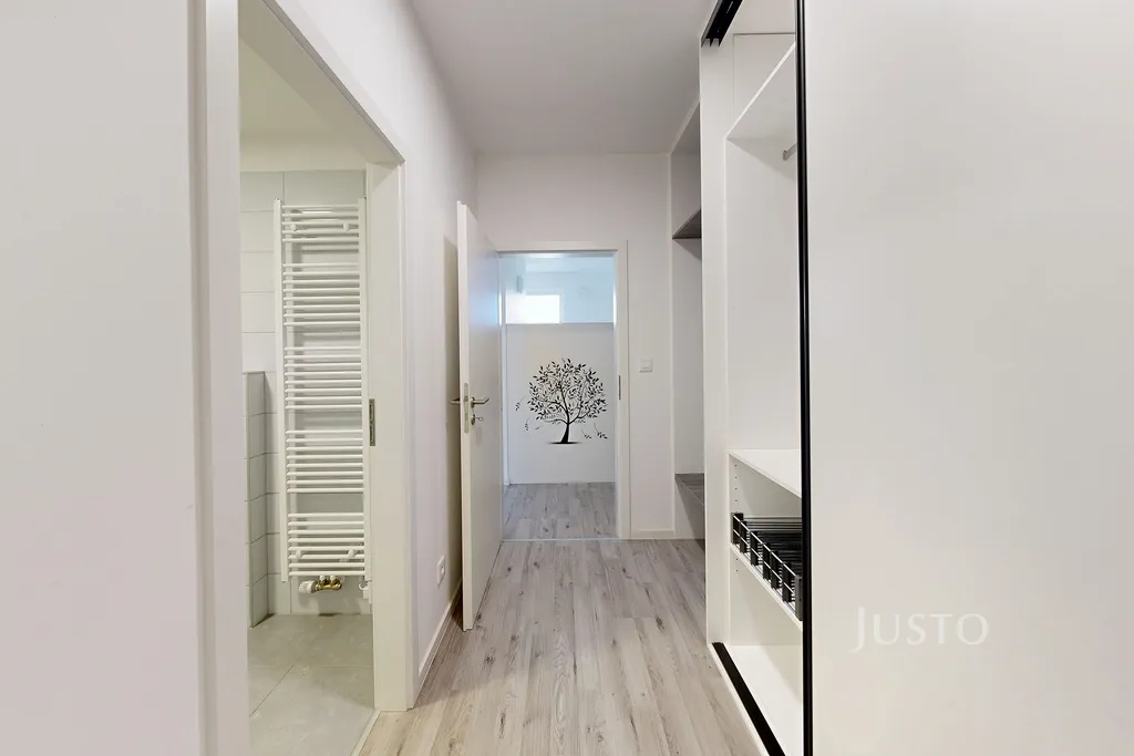 Interiér majitelé vybavili nábytkem na míru (vše, co vidíte na fotkách). Jedná se sice o byt s dispozicí 1+kk, ale v obýváku je vkusně vyřešený „spací kout“, který od prostoru kuchyně oddělen stěnou. Kuchyňská linka je kompletně zařízena – k dispozici je lednice, indukční varná deska, myčka, trouba, mrazák i barový jídelní stůl se dvěma židlemi. V koupelně najdete prostorný sprchový kout, toaletu a místo pro pračku.