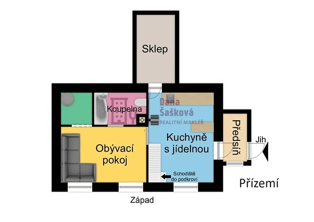 Obytná část je řešena jako 2+1, v přízemí o ploše 32,7 m2 je umístěna vstupní chodba, kuchyně s jídelním koutem, obývák, koupelna a komora.