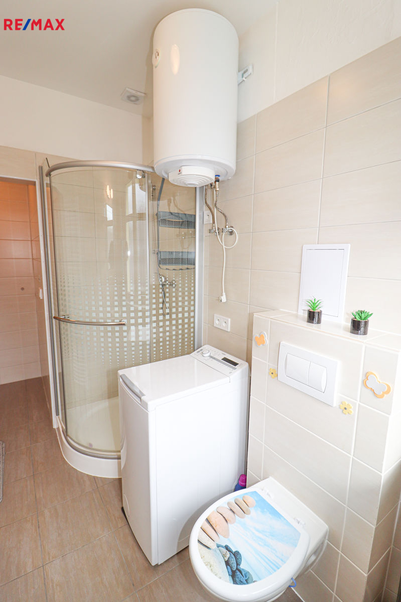 - Z obývacího pokoje je vstup do koupelny se sprchovým koutem a toaletou