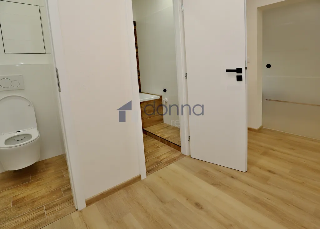 Z velké vstupní chodby se vstupuje posuvnými skleněnými dveřmi do obývacího pokoje s kuchyní, do malé ložničky a do příslušenství: koupelny s vanou a umyvadlem, kde je i příprava na pračku a na samostatnou toaletu.