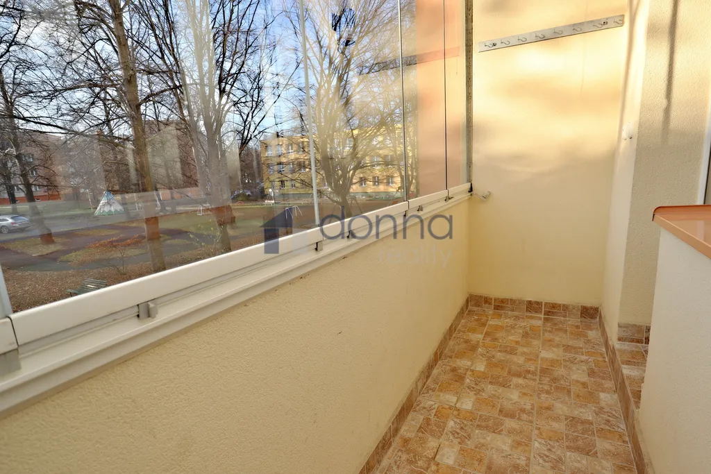 Z obývacího pokoje se vchází do dalšího pokoje se vstupem na zasklenou lodžii s výhledem na vzrostlou zeleň. Podlahy vinyl a dlažba, topení centrální dálkové. Součástí nájmu je i sklep v suterénu budovy o ploše cca 3m2.