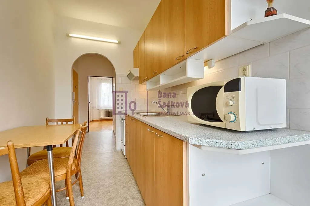 Byt orientovaný na jihozápad a severovýchod je vybavený kuchyňskou linkou, elektrickým sporákem, digestoří, mikrovlnnou troubou, jídelním stolem se dvěma židlemi a vestavěnou skříní v chodbě.