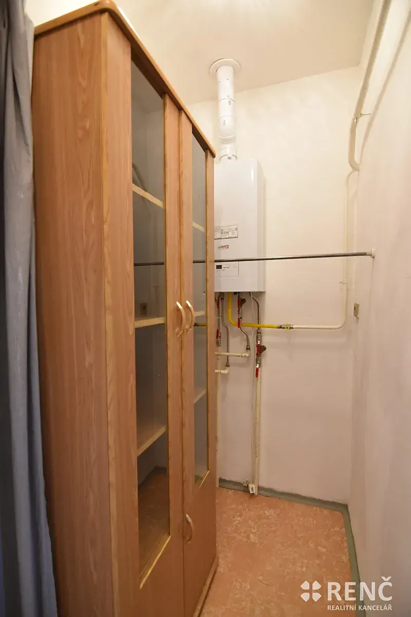 Byt je vybaven kuchyňskou linkou, sporákem, digestoří a spíží v kuchyni a skříní v komoře. Pod stropem v předsíni je vybudován úložný prostor. Koupelna je vybavena vanou a umyvadlem, toaleta je umístěna zvlášť. Vytápění bytu a ohřev vody je zajištěn vlastním plynovým kotlem. Byt je bíle vymalován, bylo odstraněno obložení stropu, které je na fotografiích.