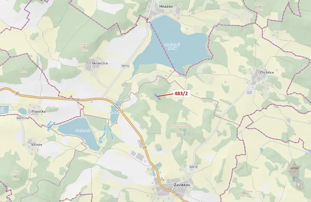 Lesní pozemek o výměře 2895 m2, parcelní číslo 483/2, podíl 1/1, katastrální území Zavlekov, obec Zavlekov, obec s rozšířenou působností Klatovy, okres Klatovy, Plzeňský kraj. Po těžbě.