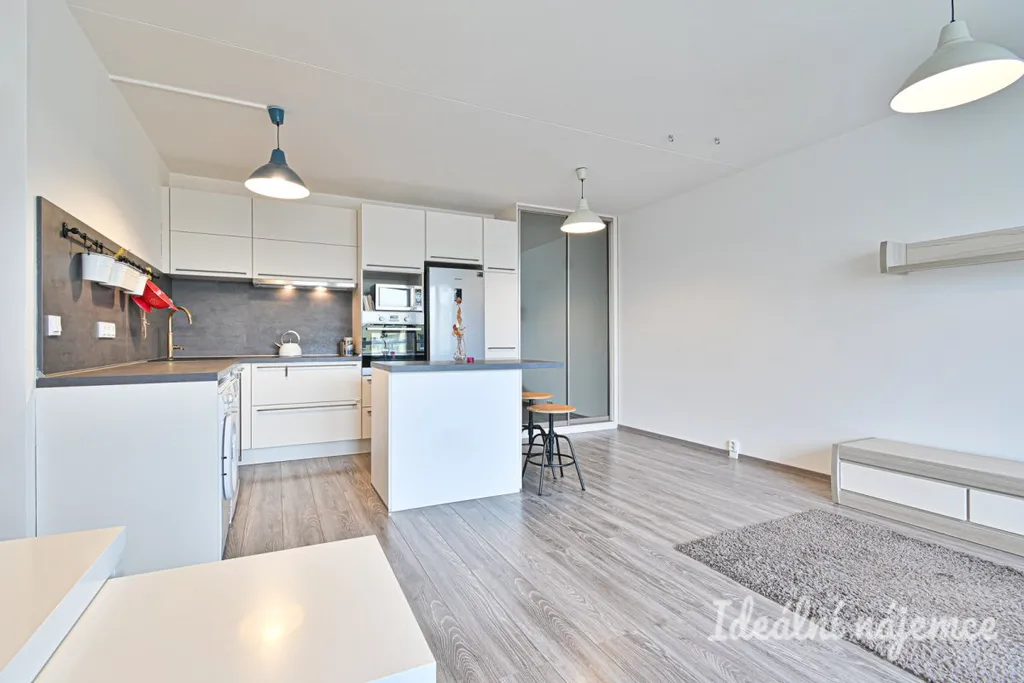 Kuchyně je spojena s obývacím pokojem a nabízí plně vybavenou kuchyňskou linku – k dispozici je trouba, varná deska, digestoř, mikrovlnná trouba, lednice, myčka nádobí a také pračka. V obývací části se nachází TV stěna, jídelní stůl se židlemi a prostorná vestavná skříň, která poskytuje dostatek úložného prostoru. V ložnici je umístěna další šatní skříň.