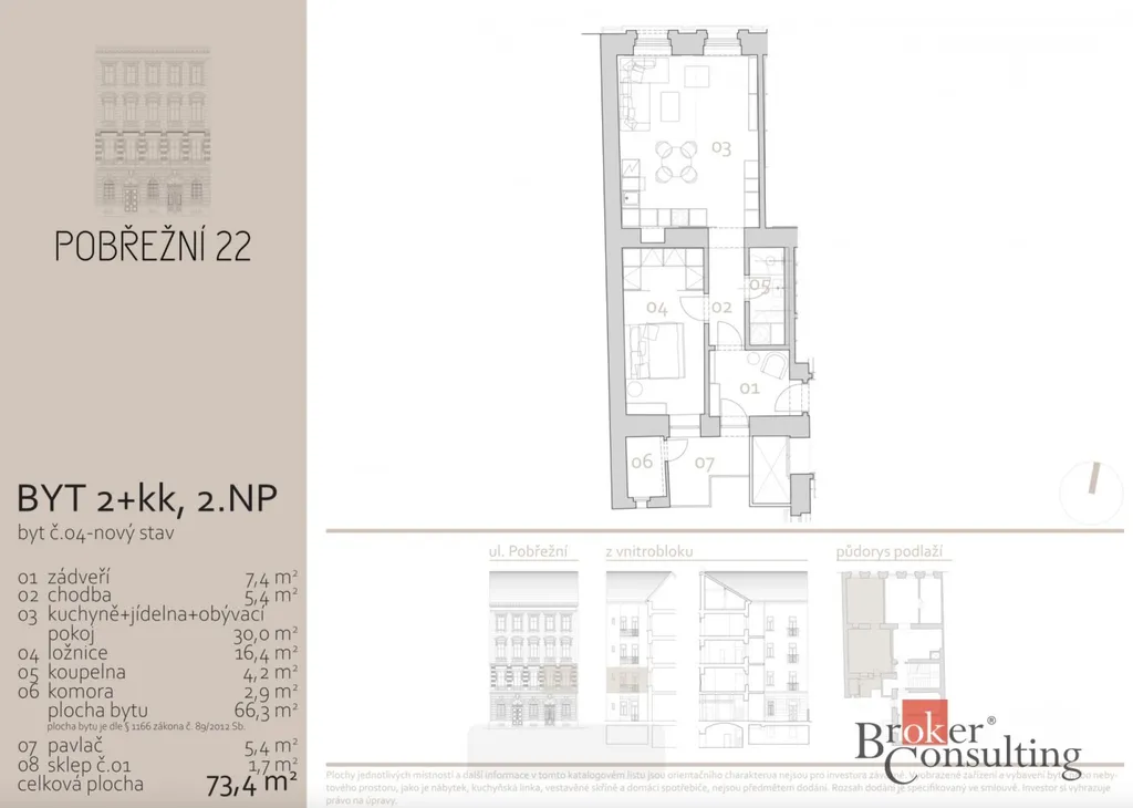 Tento byt je o dispozici 2+kk s celkovou plochou 73,4 m2, z toho pavlač má 5,4 m2 a sklep 1,7 m2. Je umístěn ve druhém nadzemním podlaží historického cihlového domu. Každý byt projde pečlivou rekonstrukcí, díky níž získáte moderní, komfortní bydlení s důrazem na detail – od prémiových podlah, přes designové dveře až po kvalitní koupelny. Ve všech bytech naleznete