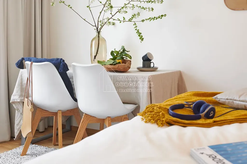 Byt bude pronajímán jako vybavený nábytkem i spotřebiči - velká skříňová stěna v obytném pokoji, pohovka s úložným prostorem, sklopná dvojpostel (200 x 180 cm) se zdravotní matrací, stůl, 2 židle, kuchyňská linka včetně vestavěných spotřebičů (lednička, mrazák, myčka, indukční varná deska, digestoř, mikrovlnná trouba s funkcí grilu). Ve vstupní chodbě je vestavěná skříň, ve které je umístěna i pračka se sušičkou (v jednom). Koupelna je se sprchovým koutem a WC.