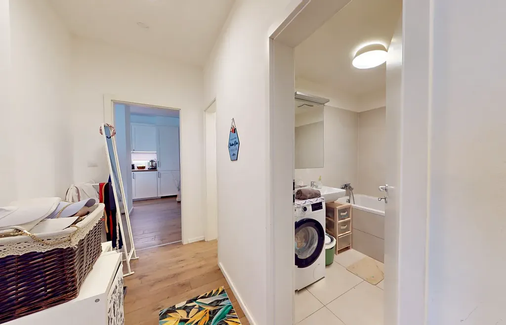 Prostorná dispozice 2+kk s promyšleným využitím každého metru (aktuálně upraveno: obývací pokoj s kuchyňským koutem, ložnice a dětský pokoj).