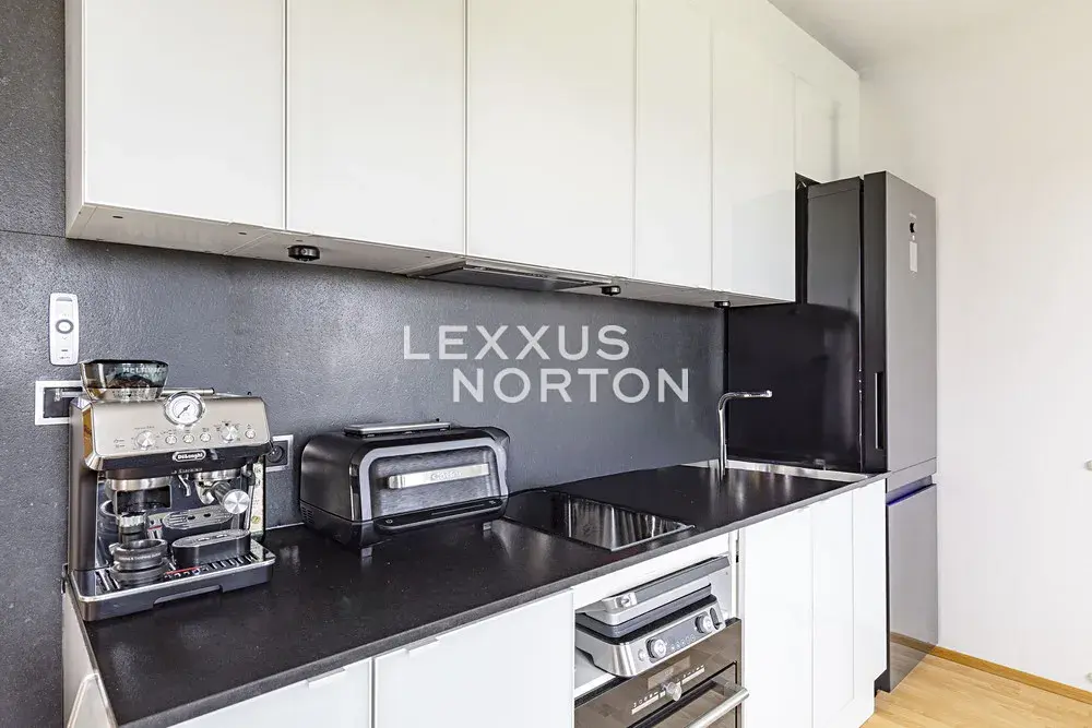 Ve vstupní chodbě se nachází prostorná skříň. Kuchyňský kout je plně vybaven – k dispozici je sklokeramická varná deska, trouba, lednice s mrazákem, myčka nádobí a pračka. Jídelní prostor je oddělený clonou a je v něm umístěn jídelní stůl se židlemi. Obytnou část tvoří rozkládací pohovka s televizí. Koupelna je vybavena sprchovým koutem a samostatnou toaletou. Byt je navíc osazen elektrickými venkovními žaluziemi a venkovní roletou, která dokáže zastínit téměř celou terasu.