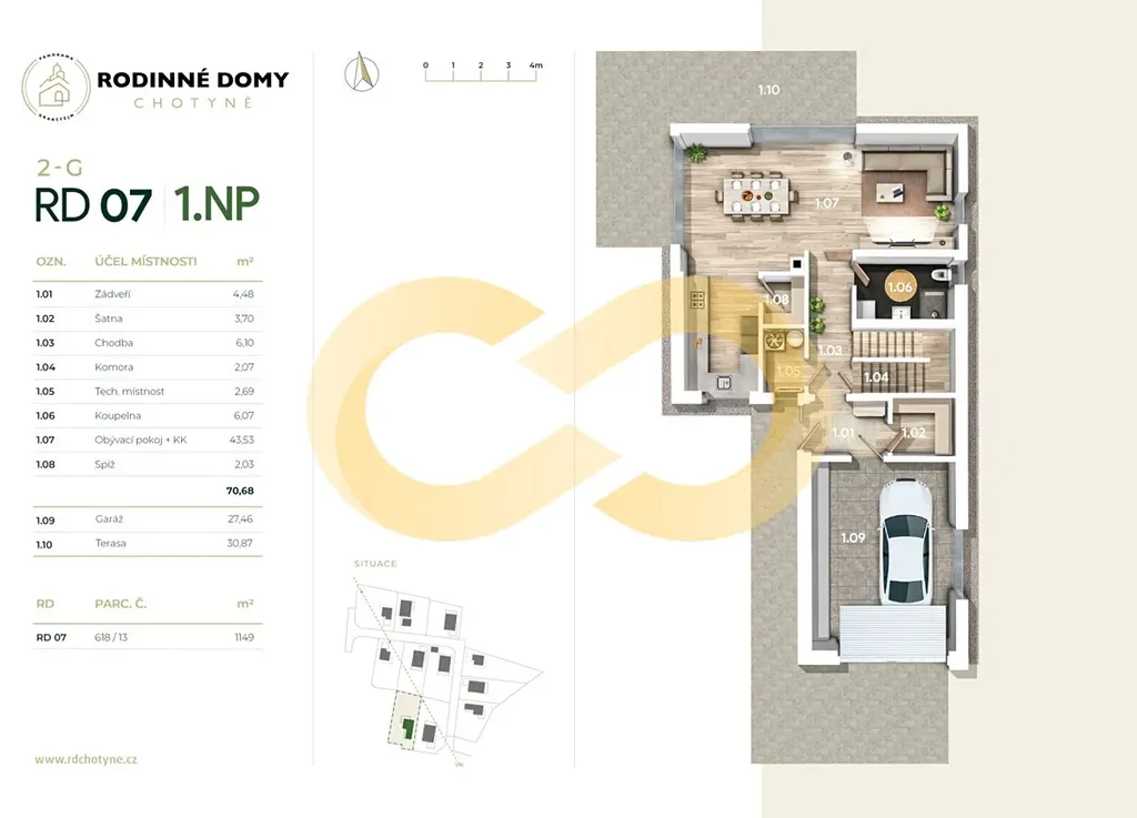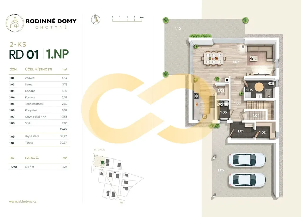 Výstavba bude dokončená na konci roku 2025, ale svůj budoucí domov si můžete prohlédnout už teď. Stačí si domluvit prohlídku vzorového domu – ten je kompletně zařízený a vy tak získáte jasnou představu, jak se vám bude v Chotyni bydlet.
