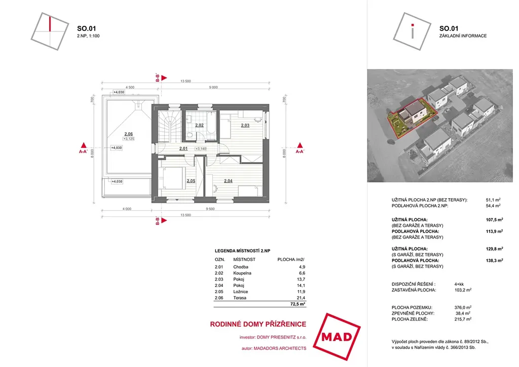 Celková plocha pozemku je 376m², plocha zahrady 215,7m² a terasa na střeše 1NP má 21,4m².