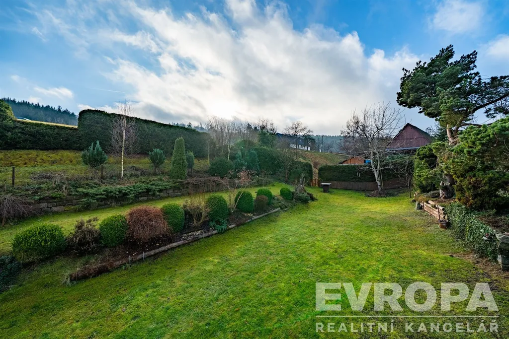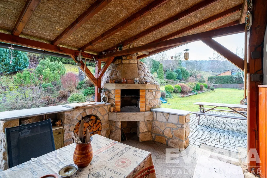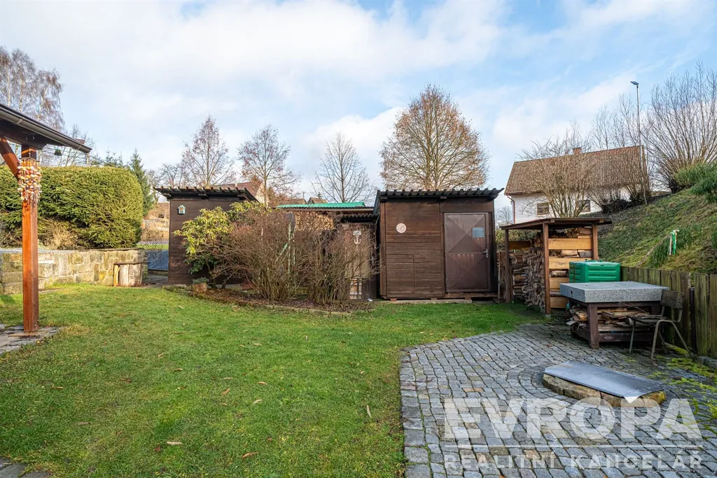 Zahrada o rozloze 850 m² nabízí mnoho krásných zákoutí, terasy, kamenné zídky a dostatek soukromí. K domu patří krytá terasa s kamenným grilem – perfektní pro letní večery s rodinou či přáteli. Na pozemku nechybí ani prostorná kůlna na nářadí a zahradní techniku.