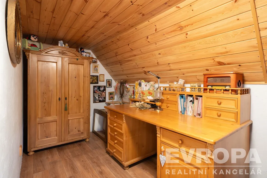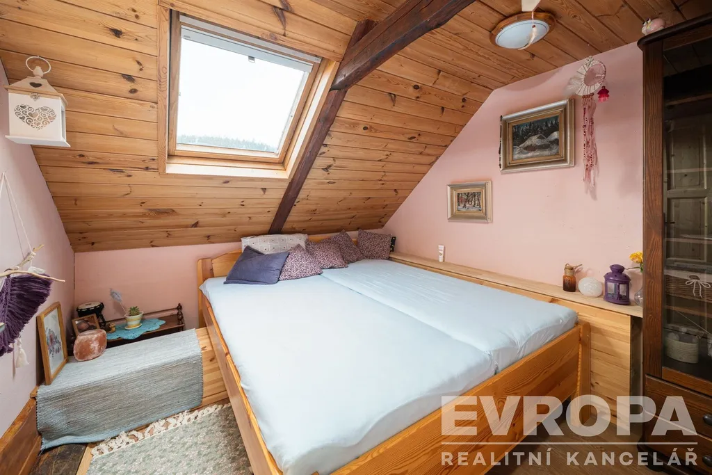 Podkroví nabízí klidnou ložnici s dvojlůžkem a prostornou víceúčelovou místnost s několika lůžky, pracovním koutem a samostatným WC – skvělé pro rodinu, hosty nebo jako soukromý ateliér.
