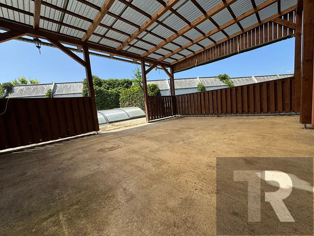Na pozemku zapuštěný bazén se zastřešením, krytá pergola, kryté stání na auto, garáž pro jedno auto s úložným prostorem, skleník, zahradní domek a malé jezírko.